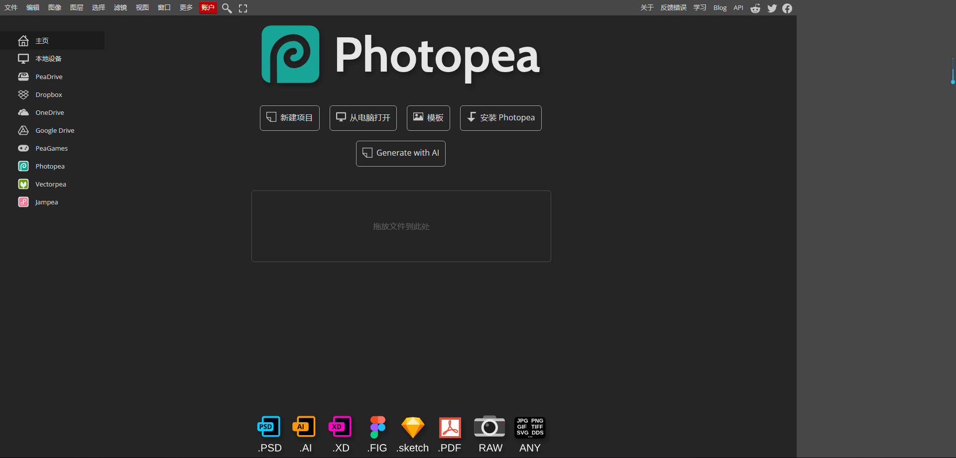 Photopea 是目前最强的在线 PS 类工具,完全在浏览器运行,支持图层、蒙版、滤镜、笔刷,甚至可以直接打开 PSD 文件。