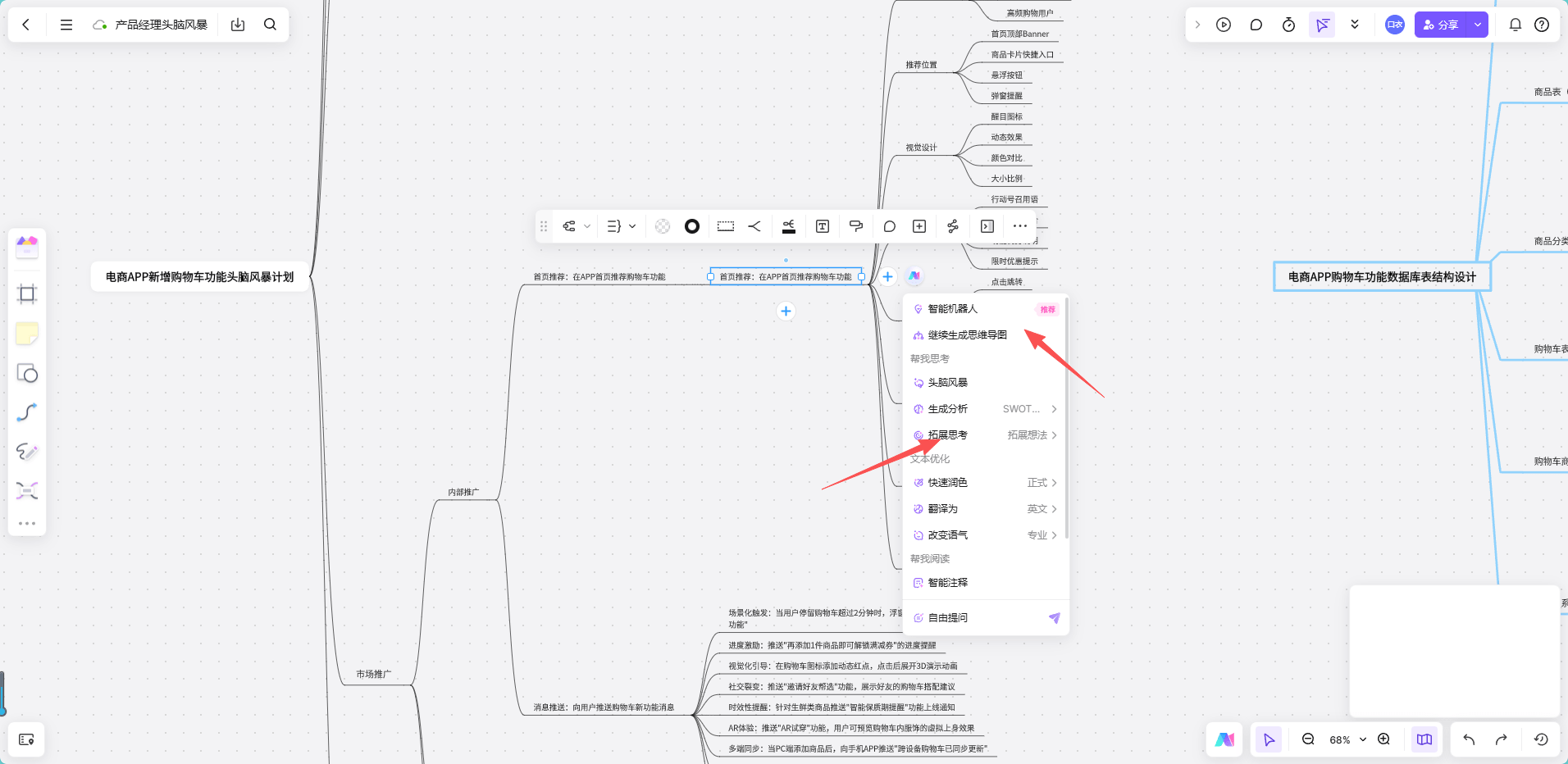 通过“继续生成思维导图”拿到结构骨架,“拓展思考”补齐问题清单,两者侧重点不同但能互补,组合使用能把细节补齐、风险暴露出来、把模糊的想法变成可评审的条目。这相当于给评审会配了个24小时在线的产品搭档,既能快速出形、又能深挖细节,让方案不只有框架,还更完备。