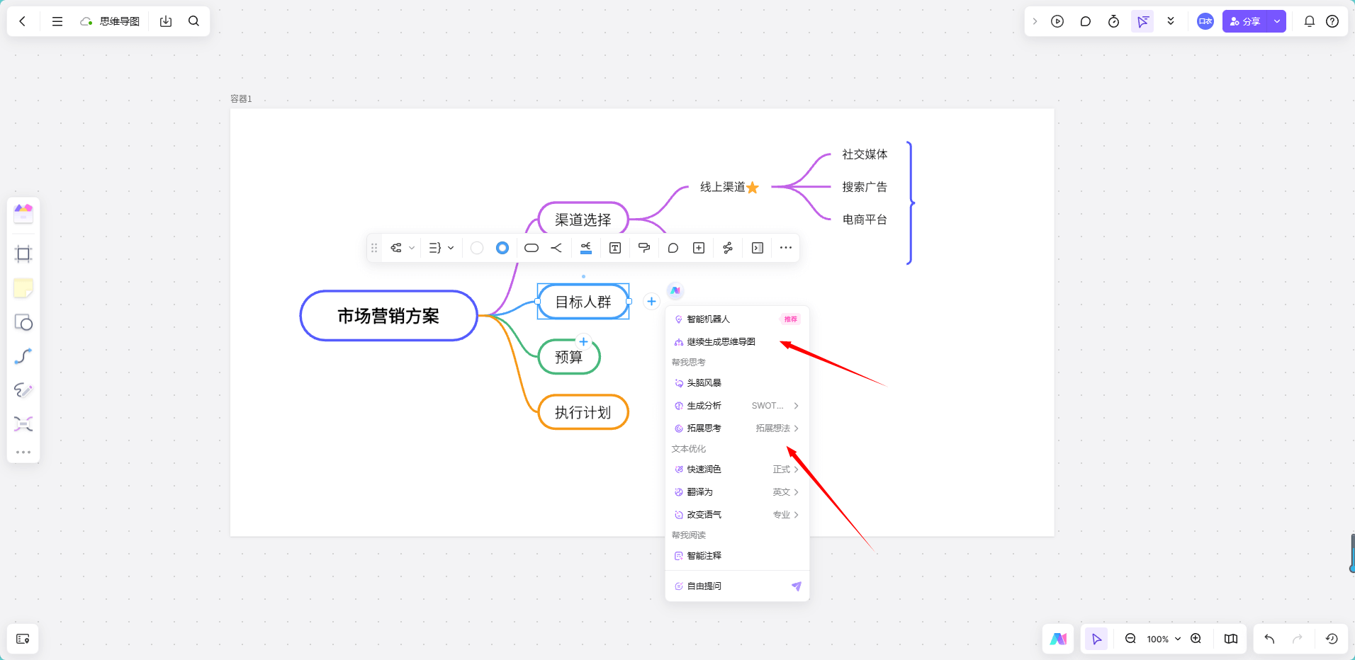 从中心节点出发,先添加几个主分支。这些主分支相当于大纲里的一级标题,可以是目标人群、渠道选择、预算、执行计划等,它们决定了整个导图的骨架,必须简洁、核心。