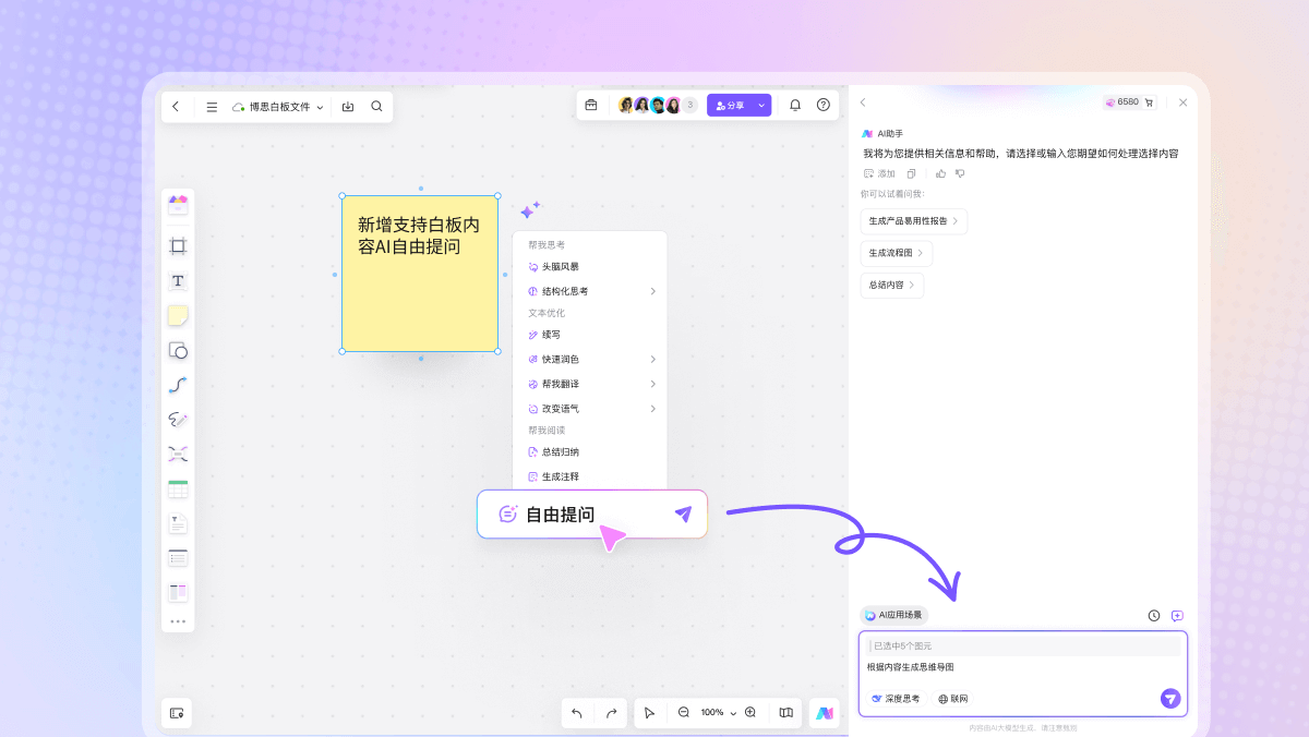 boardmix 集成的 AI 功能正在重新定义数字白板的智能化边界。它能够自动整理杂乱的便签内容,归纳关键观点;根据文字描述生成结构化的思维导图或流程图;甚至在头脑风暴环节主动提出创意建议,帮助团队突破思维瓶颈。